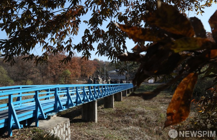 [판문점=뉴스핌] 사진공동취재단 = 판문점견학지원센터 개소식에 참가했던 시범견학단이 4일 오전 경기도 파주시 판문점 견학 코스에 포함된 도보다리를 둘러보고 있다. 2020.11.04 photo@newspim.com