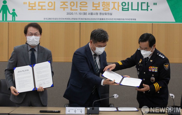 [서울=뉴스핌] 윤창빈 기자 = 조희연 서울시교육감, 서정협 서울특별시장 권한대행, 장하연 서울지방경찰청장이 10일 오전 서울 중구 시청 영상회의실에서 열린 '보행안전 공동협력 협약식'에서 협약서 교환을 하고 있다. 2020.11.10 pangbin@newspim.com