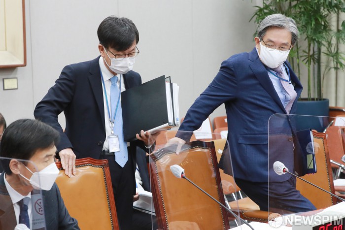 [서울=뉴스핌] 이형석 기자 = 노영민 청와대 비서실장(오른쪽)과 김상조 정책실장이 13일 오전 서울 여의도 국회에서 열린 국회운영위원회 전체회의에 참석하고 있다. 2020.11.13 leehs@newspim.com