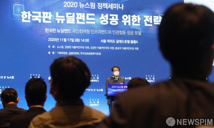 [서울=뉴스핌] 김학선 기자 = 신현태 뉴스핌 부사장이 17일 서울 여의도 글래드호텔에서 열린 '2020 뉴스핌 정책세미나 : 한국판 뉴딜펀드 성공 위한 전략'에서 개회사를 하고 있다. 이날 세미나에서는 홍성국 더불어민주당 의원과 권중각 기획재정부 민간투자정책 과장, 노해성 한국성장금융 투자운용실장, 김남기 미래에셋자산 ETF운용부문 부문장, 이효섭 자본시장연구원 박사 등이 뉴딜펀드의 성공모델과 투자전략 등을 소개하고 패널토론을 진행했다. 2020.11.17 yooksa@newspim.com