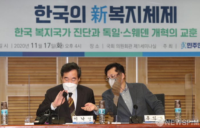 [서울=뉴스핌] 이형석 기자 = 이낙연 대표와 홍익표 민주연구원장이 17일 오후 국회 의원회관에서 더불어민주당 민주연구원이 주최한 한국의 신복지체제 세미나에서 대화를 하고 있다. 2020.11.17 leehs@newspim.com