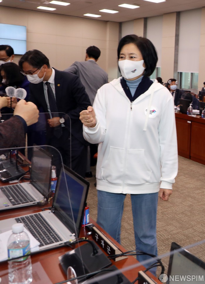 [서울=뉴스핌] 최상수 기자 = 흰색 후드티에 청바지 차림의 박영선 중소벤처기업부 장관이 19일 국회에서 열린 국회 산업통상자원중소벤처기업위원회 전체회의가 산회된 후 의원들과 인사를 하고 있다. 박 장관은 의원들에게 경기도 고양시 CJ ENM 제작센터에서 열린 국내 최대 규모의 창업 스타트업 축제인 '컴업 2020' 개막식에 참석 후 국회로 와 복장이 이런점을 양해해 달라고 설명했다. 2020.11.19 kilroy023@newspim.com