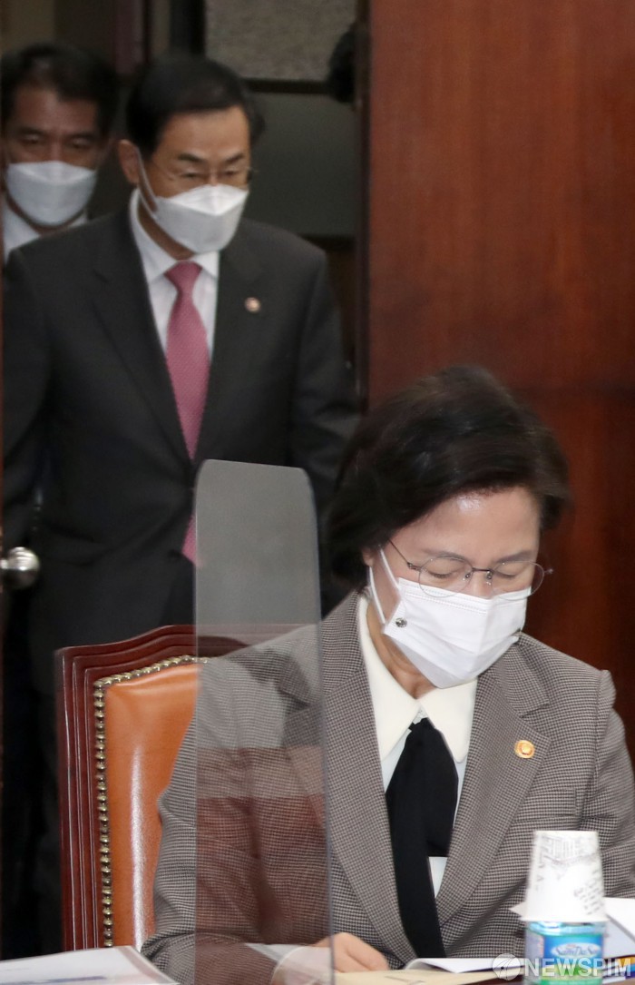 [서울=뉴스핌] 최상수 기자 = 추미애 법무부 장관이 25일 오후 서울 여의도 국회에서 열린 공수처장 후보추천위원회 전체회의에 참석하고 있다. 뒤는 조재연 위원장. 2020.11.25 kilroy023@newspim.com