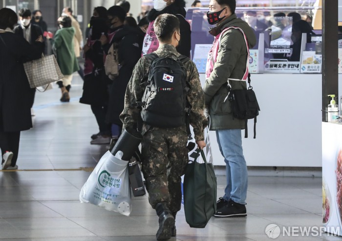 [서울=뉴스핌] 이한결 기자 = 국방부가 다음 달 7일까지 전 부대에 대해 ‘군내 거리두기’를 2.5단계로 격상한다고 밝힌 26일 오후 서울 용산구 서울역 맞이방에서 휴가를 나가거나 복귀하는 군 장병들이 열차를 기다리고 있다. 해당 기간 전 장병의 휴가와 외출은 잠정 중지되며 간부들은 사적 모임과 회식을 연기하거나 취소해야 한다. 2020.11.26 alwaysame@newspim.com