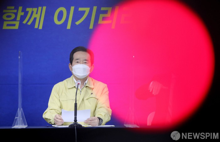 [서울=뉴스핌] 이형석 기자 = 정세균 국무총리가 29일 오후 서울 종로구 정부서울청사에서 열린 '코로나19 극복 긴급 기자 간담회'에 모두발언을 하고 있다. 수도권에 대해서 2단계초치를 유지하되 방역 조치를 강화하기로 했다. 2020.11.29 leehs@newspim.com