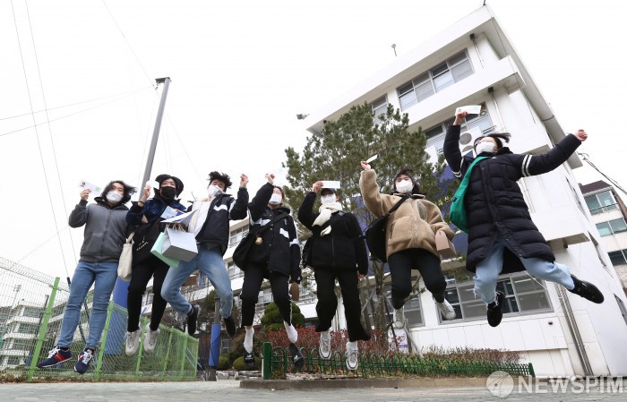 [서울=뉴스핌] 정일구 기자 = 2021학년도 대학수학능력시험 예비소집일인 2일 오전 서울 용산구 선린인터넷고에서 수험생들이 수험표를 들고 기념촬영을 하고 있다. 2020.12.02 mironj19@newspim.com