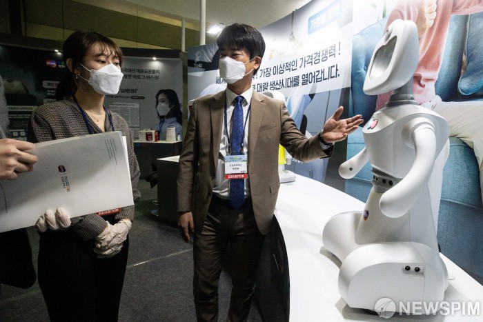 [서울=뉴스핌] 윤창빈 기자 = 2일 오후 서울 강남구 코엑스에서 열린 '2020 대한민국 소프트웨어대전'에서 한 관계자가 가정용 로봇을 설명하고 있다. 2020.12.02 pangbin@newspim.com