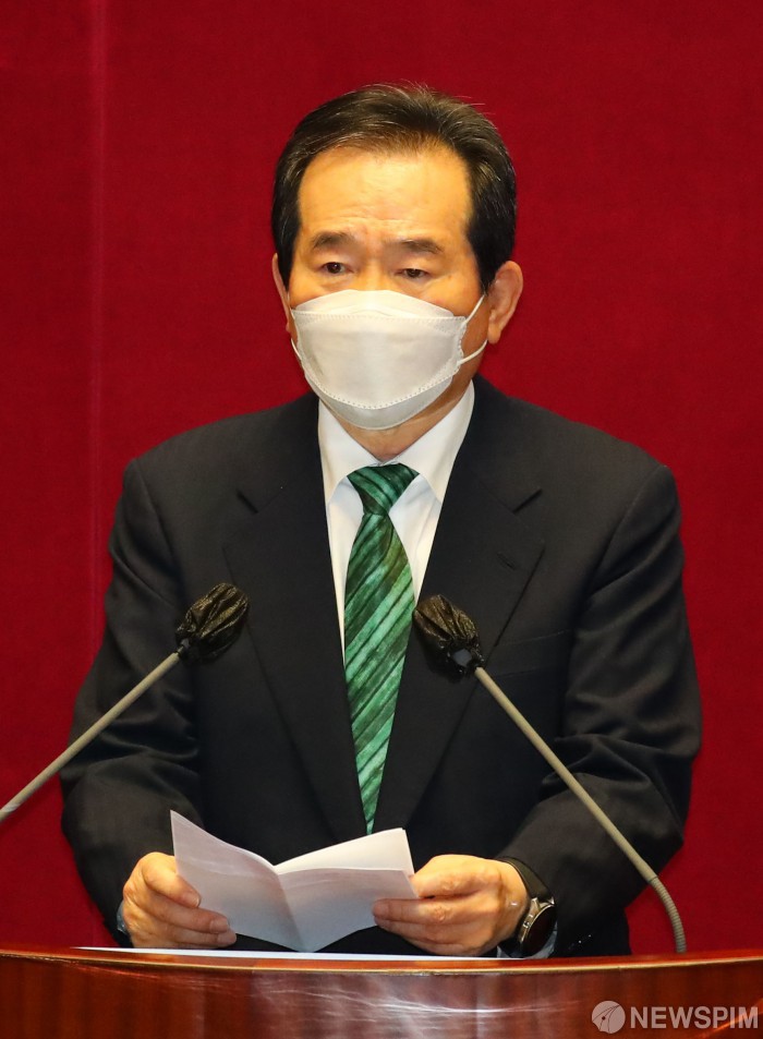 [서울=뉴스핌] 최상수 기자 = 정세균 국무총리가 2일 오후 국회에서 열린 제382회 국회 정기회에서 2021년도 예산안에 대해 발언하고 있다. 2020.12.02 kilroy023@newspim.com