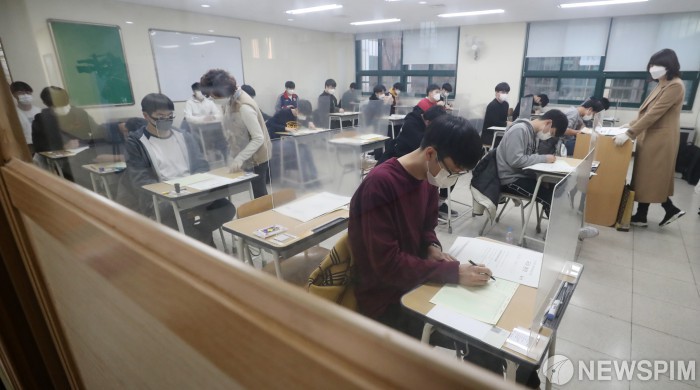 [서울=뉴스핌] 사진공동취재단 = 2021학년도 대학수학능력시험이 치러진 3일 오전 서울 종로구 경복고등학교에 고사장에서 수험생들이 시험지를 받고 답안지에 마킹하고 있다. 신종 코로나바이러스 감염증(코로나19) 여파로 2주 늦춰진 이번 수능은 역대 최소인 49만3433명이 응시한 가운데 전국 86개 시험지구 1383개 시험장에서 일제히 치러진다. 2020.12.03 photo@newspim.com
