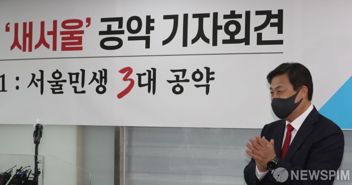 [서울=뉴스핌] 이형석 기자 = 서울시장 보궐선거 출마를 선언한 김선동 전 국민의힘 의원이 3일 오후 서울 여의도 남중빌딩 국민의힘 당사에서 열린 공약 발표 기자회견에서 박수를 치고 있다. 2020.12.03 leehs@newspim.com