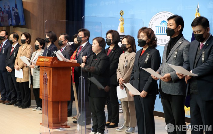 [서울=뉴스핌] 최상수 기자 = 전주혜, 이주환 의원 등 국민의힘 초선의원들이 11일 오전 국회 소통관에서 기자회견을 열고 무제한 토론에 초선의원 전원이 참가하기로 결의했다고 밝히고 있다. 2020.12.11 kilroy023@newspim.com