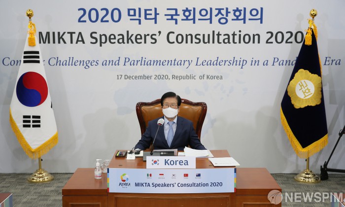 [서울=뉴스핌] 최상수 기자 = 박병석 국회의장이 17일 오후 서울 여의도 국회에서 열린 멕시코, 인도네시아, 한국, 터키, 호주 등 5개국이 참여하는 중견국 협의체 믹타(MIKTA) 국회의장 화상회의에서 발언하고 있다. 2020.12.17 kilroy023@newspim.com