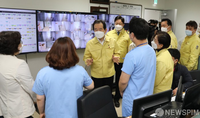 [서울=뉴스핌] 윤창빈 기자 = 정세균 국무총리가 18일 오전 서울 은평구 서울소방학교 코로나19 은평생활치료센터를 찾아 의료진들을 격려하고 있다. 2020.12.18 pangbin@newspim.com