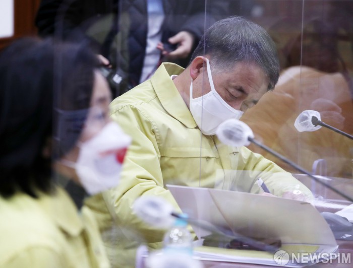[서울=뉴스핌] 정일구 기자 = 박능후 장관이 20일 오후 서울 종로구 정부서울청사에서 열린 코로나19 대응 중앙재난안전대책본부 회의에서 정세균 국무총리의 발언을 경청하고 있다. 2020.12.20 mironj19@newspim.com