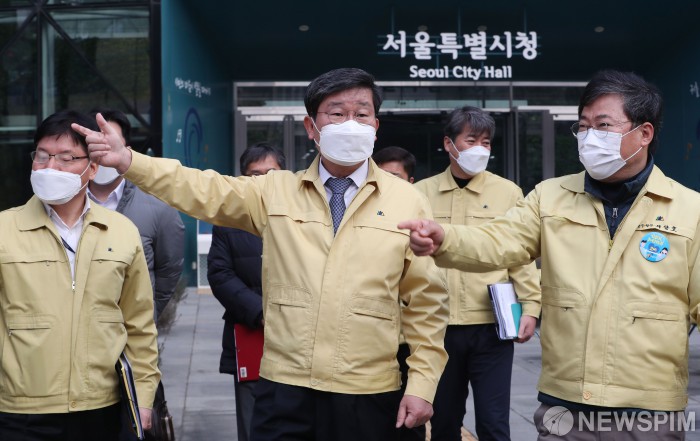 [서울=뉴스핌] 김학선 기자 = 전해철 행정안전부 장관이 28일 서울 중구 서울시청 앞에서 서울시의 신종 코로나바이러스 감염증(코로나19) 현황 보고를 받은 후 코로나19 임시 선별검사소로 향하고 있다. 2020.12.28 yooksa@newspim.com