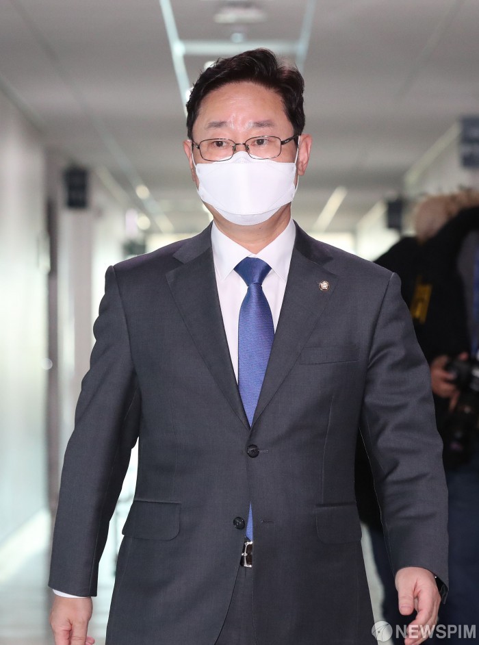 [서울=뉴스핌] 이형석 기자 = 신임 법무부 장관 후보자로 지명된 박범계 더불어민주당 의원이 30일 국회 의원회관에서 입장을 밝히기 위해 나오고 있다. 2020.12.30 leehs@newspim.com