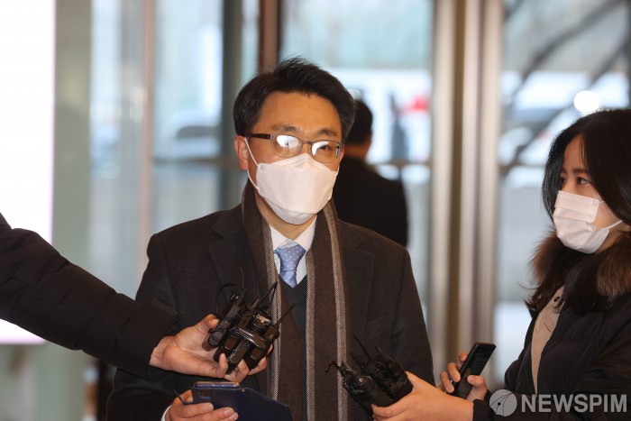[서울=뉴스핌] 윤창빈 기자 = 김진욱 고위공직자범죄수사처장 후보자가 31일 서울 종로구의 한 빌딩에 마련된 인사청문회 준비 사무실로 출근하며 발언하고 있다. 2020.12.31 pangbin@newspim.com