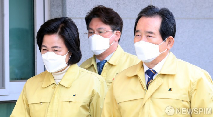 [서울=뉴스핌] 윤창빈 기자 = 정세균 국무총리가 2일 서울 송파구 동부구치소에서 추미애 법무부 장관과 신종 코로나바이러스 감염증(코로나19) 현장 점검을 하고 있다. 동부구치소에서는 전날 13명의 확진자가 나와 관련 확진자는 총 946명(전국 958명)으로 늘어났다. 2021.01.02 pangbin@newspim.com