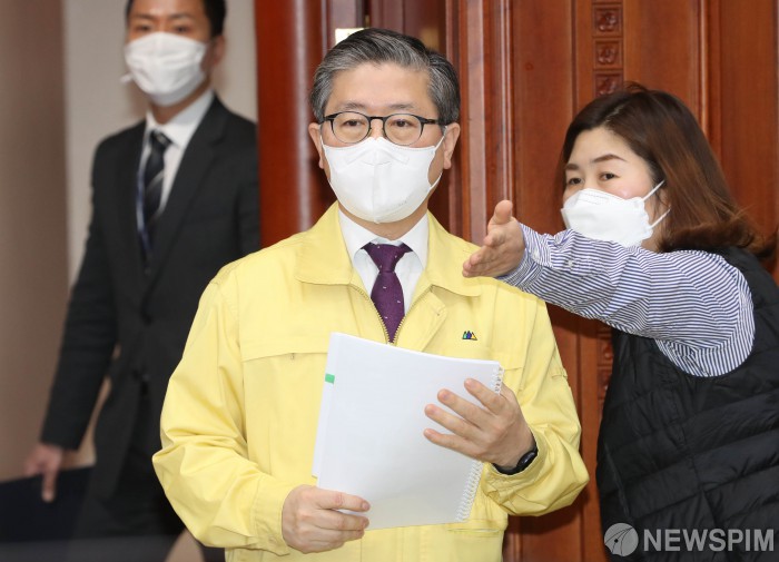 [서울=뉴스핌] 김학선 기자 = 변창흠 국토교통부 장관이 6일 서울 종로구 정부서울청사에서 열린 비상경제 중앙대책본부 회의 겸 한국판 뉴딜 관계장관회의에 참석하고 있다. 2021.01.06 yooksa@newspim.com