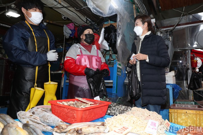 [서울=뉴스핌] 김학선 기자 = 서울시장 보궐선거에 출마한 나경원 국민의힘 전 의원이 23일 오후 서울 영등포구 대림중앙시장을 방문해 꼬막을 구입하며 상인과 이야기를 나누고 있다. 2021.01.23 yooksa@newspim.com