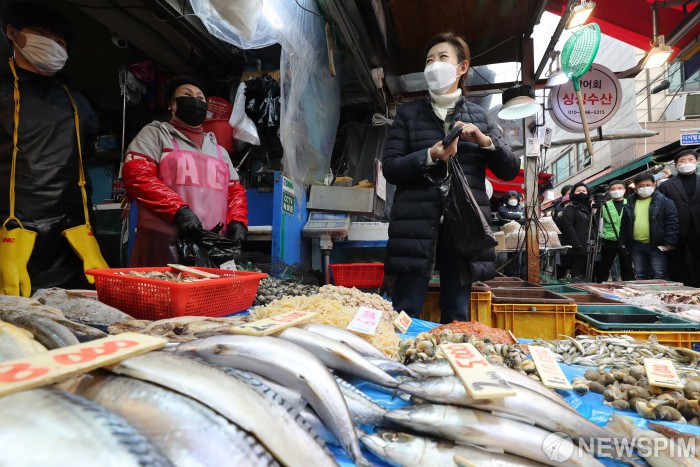 [서울=뉴스핌] 김학선 기자 = 서울시장 보궐선거에 출마한 나경원 국민의힘 전 의원이 23일 오후 서울 영등포구 대림중앙시장을 방문해 꼬막을 구입하며 상인과 이야기를 나누고 있다. 2021.01.23 yooksa@newspim.com