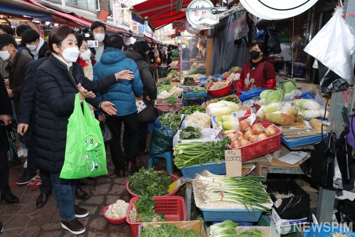 [서울=뉴스핌] 김학선 기자 = 서울시장 보궐선거에 출마한 나경원 국민의힘 전 의원이 23일 오후 서울 영등포구 대림중앙시장을 방문해 상인들과 인사를 나누고 있다. 2021.01.23 yooksa@newspim.com