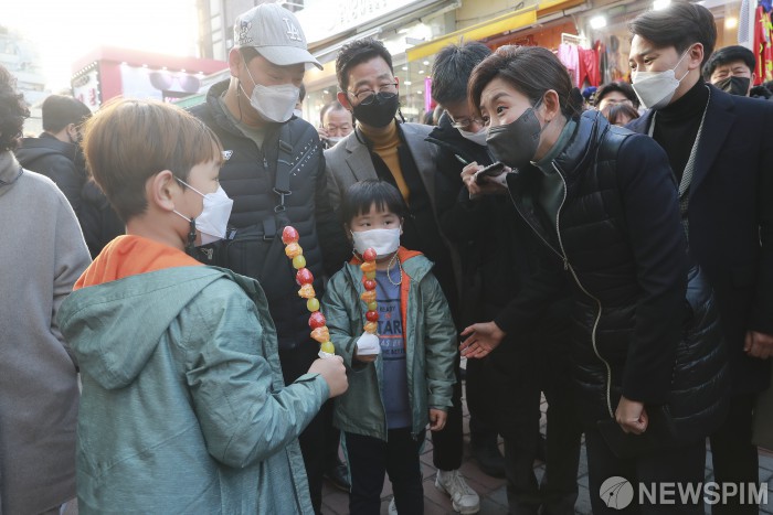 [서울=뉴스핌] 이형석 기자 = 서울시장 보궐선거에 출마한 나경원 국민의힘 전 의원이 24일 오후 서울 마포구 홍대문화거리를 찾아 나들이를 나온 아이들과 대화를 나누고 있다. 2021.01.24 leehs@newspim.com