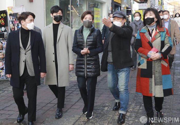 [서울=뉴스핌] 이형석 기자 = 서울시장 보궐선거에 출마한 나경원 국민의힘 전 의원이 24일 오후 서울 마포구 홍대문화거리를 찾아 상인들과 대화를 나누고 있다. 2021.01.24 leehs@newspim.com