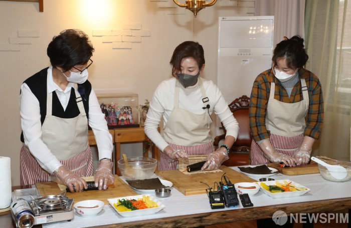 [서울=뉴스핌] 이형석 기자 = 서울시장 보궐선거에 출마한 나경원 국민의힘 전 의원이 26일 오후 서울 마포구 연남동 '바투 스테이'에서 여성일자리 현장 체험 프로그램에 참여해 김밥을 말고 있다. 2021.01.26 leehs@newspim.com