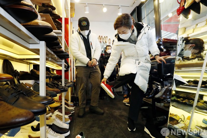 [서울=뉴스핌] 국회사진취재단 = 서울시장 보궐선거 출마를 선언한 나경원 전 국민의힘 의원이 28일 서울 성수동 수제화거리 내 한 매장을 방문해 구매 전 수제화를 신어 보고 있다. 2021.01.28 photo@newspim.com
