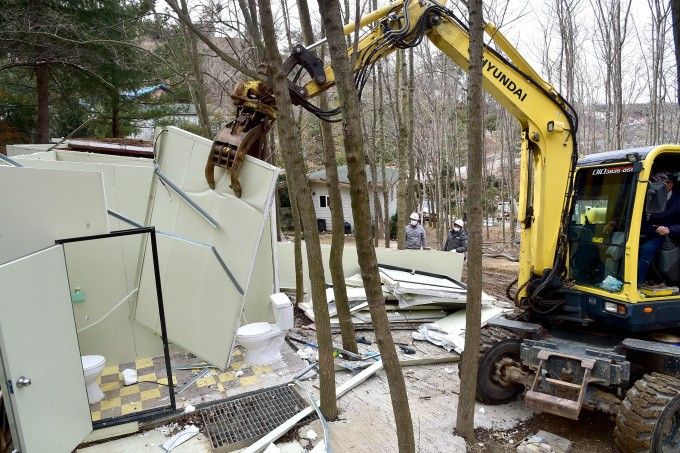 | 경남 진주시가 5일 코로나19 집단감염이 발생한 국제기도원의 불법 건물의 철거를 단행하고 있다.[사진=진주시] 2021.02.05 news2349@newspim.com |