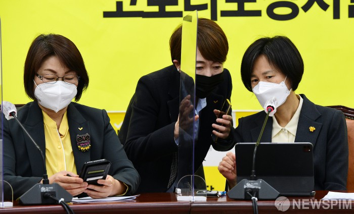 [서울=뉴스핌] 최상수 기자 = 강은미 정의당 비상대책위원장과 정호진 수석대변인이 15일 국회에서 열린 비상대책위원회 회의에서 대화를 나누고 있다. 2021.02.15 kilroy023@newspim.com