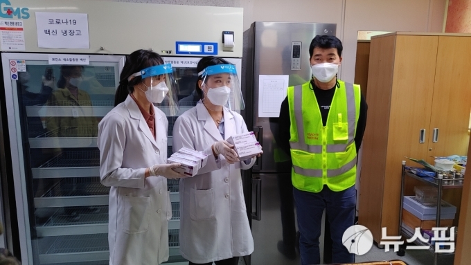 [안동=뉴스핌] 이민 기자 = 25일 오후 2시쯤 안동시 보건소에 아스트라제니카 백신을 실은 운송트럭이 도착해 보건장국 관계자가 백신을 이송하고 있다. lm8008@newspim.com