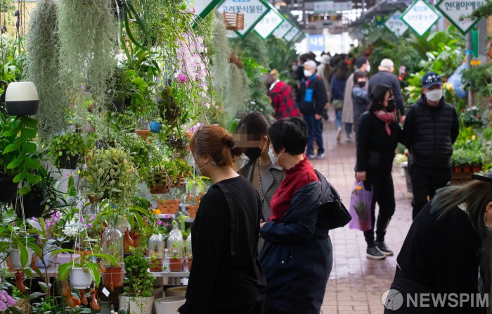[서울=뉴스핌] 윤창빈 기자 = 절기상 경칩을 맞은 5일 오후 서울 서초구 양재동 화훼공판장을 찾은 시민들이 꽃을 구매하고 있다. 2021.03.05 pangbin@newspim.com