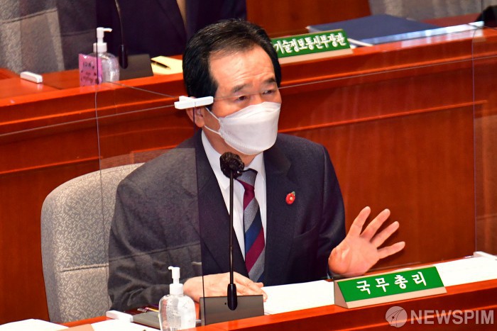 [서울=뉴스핌] 이형석 기자 = 정세균 국무총리가 19일 서울 여의도 국회에서 열린 예산결산특별위원회 전체회의에서 의원 질의에 답변 하고 있다. 2021.03.19 leehs@newspim.com