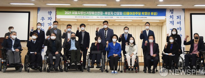 [서울=뉴스핌] 최상수 기자 = 박영선 더불어민주당 서울시장 후보가 19일 서울 여의도 이룸센터 이룸홀에서 열린 2021 서울지방선거장애인연대 후보자 간담회에 참석해 간담회를 마친 뒤 참석자들과 기념촬영을 하고 있다. 2021.03.19 kilroy023@newspim.com