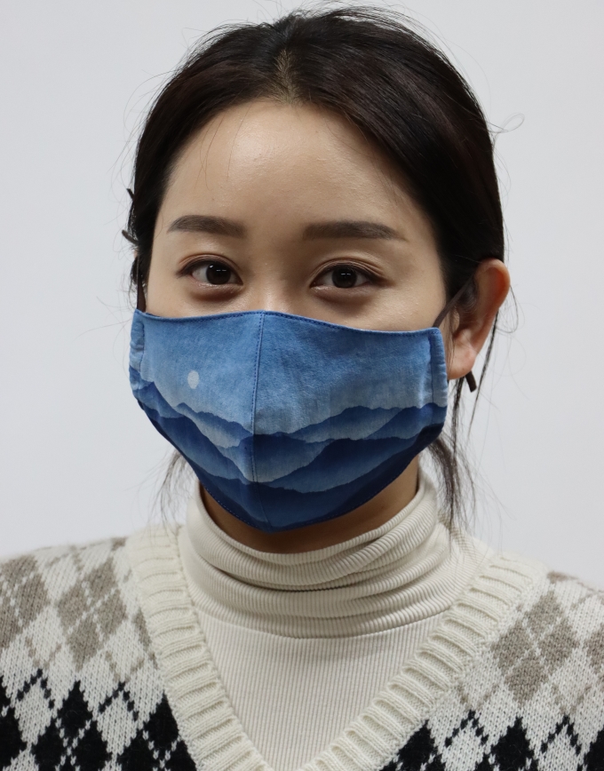 마스크는 재단 천연염색 문양염 강사로 활동 중인 김말례 작가가 금성산, 지리산 산수화 작품을 쪽 염색으로 표현해냈다.