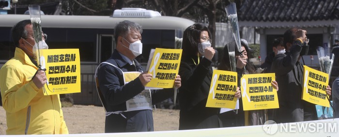 [서울=뉴스핌] 최상수 기자 = 4·16세월호참사 가족협의회, 4월16일의약속국민연대가 22일 오전 서울 종로구 청와대 앞에서 세월호 참사 7주기 기억과 약속의 달 선포 기자회견을 열고 있다. 2021.03.22 kilroy023@newspim.com