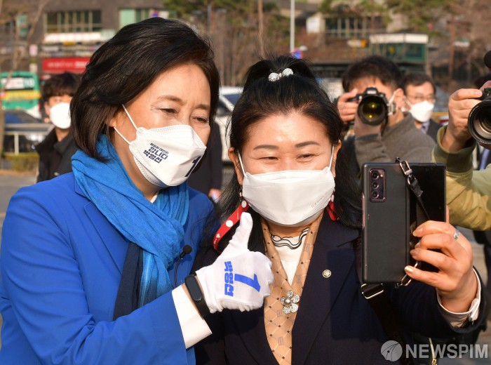 [서울=뉴스핌] 국회사진취재단 = 4.7재보궐선거운동 첫 날인 25일 박영선 더불어민주당 서울시장 후보가 25일 서울 구로구 신도림역에서 출근인사를 하는 도중 시민과 사진을 찍고 있다. 2021.03.25 photo@newspim.com