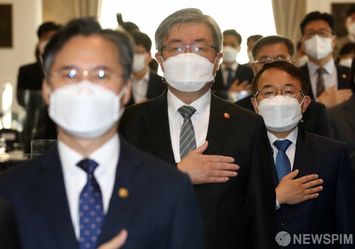 [서울=뉴스핌] 백인혁 기자 = 26일 오전 서울 중구 프레스센터에서 열린 제19차 일자리위원회에서 참석자들이 국민의례를 하고 있다. 오른쪽부터 김용기 일자리위원회 부위원장, 이재갑 고용노동부 장관, 박진규 산업통상자원부 차관. 2021.03.26 dlsgur9757@newspim.com