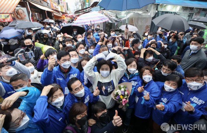[서울=뉴스핌] 최상수 기자 = 박영선 더불어민주당 서울시장 후보가 27일 서울 중랑구 면목역 근처에서 선거 유세에 나서 지지자들과 기념촬영을 하고 있다. 2021.03.27 kilroy023@newspim.com