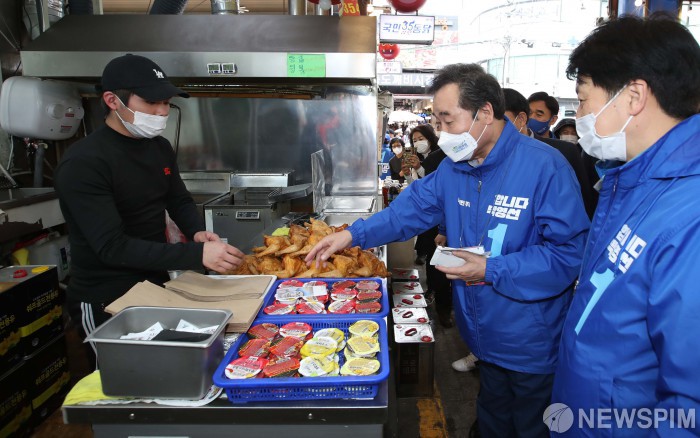 [서울=뉴스핌] 최상수 기자 = 이낙연 더불어민주당 상임선대위원장이 4일 서울 도봉구 방학동 도깨비시장을 방문해 물건을 구매하고 있다. 2021.04.04 kilroy023@newspim.com