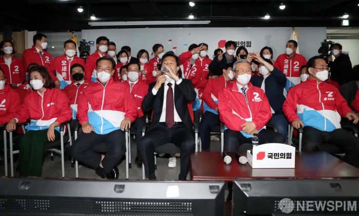 [서울=뉴스핌] 국회사진취재단 = 오세훈 국민의힘 서울시장 후보가 7일 오후 서울 여의도 국민의힘 중앙당사에 마련된 개표상황실에서 4·7재보선 출구조사 결과를 기다리며 물을 마시고 있다. 2021.04.07 photo@newspim.com