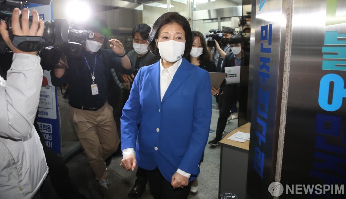 [서울=뉴스핌] 최상수 기자 = 출구조사 결과 오세훈 국민의힘 서울시장 후보가 당선 가능성이 높을 것으로 밝혀진 7일 오후 서울 여의도 더불어민주당사를 찾은 박영선 후보가 개표상황실을 거치지 않고 건물을 나서고 있다. 2021.04.07 kilroy023@newspim.com