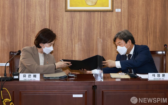 [서울=뉴스핌] 유은혜 사회부총리 겸 교육부 장관이 지난 8일 오후 서울 종로구 정부서울청사에서 열린 그린스마트 미래학교 건축 분야 업무 협약식에서 협력사 대표들과 업무 협약서에 서명을 하고 있다. [사진=교육부] 2021.04.09 pangbin@newspim.com