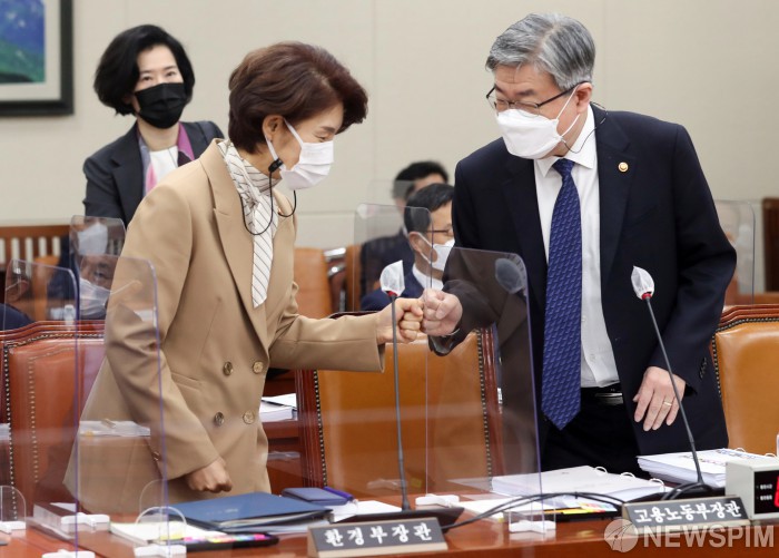 [서울=뉴스핌] 이형석 기자 = 한정애 환경부 장관(왼쪽)과 이재갑 고용노동부 장관이 20일 서울 여의도 국회에서 열린 환경노동위원회 전체회의에 출석하며 주먹인사를 하고 있다. 2021.04.20 leehs@newspim.com
