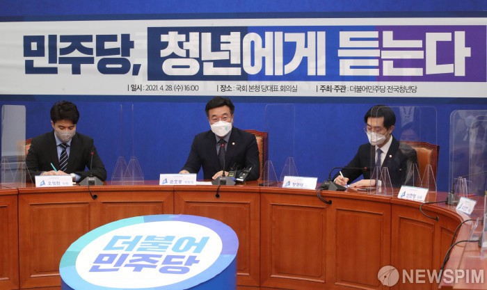 [서울=뉴스핌] 최상수 기자 = 윤호중 더불어민주당 비상대책위원장이 28일 오후 서울 여의도 국회에서 전국청년당 간담회 '민주당, 청년에게 듣는다'에서 인사말을 하고 있다. 2021.04.28 kilroy023@newspim.com