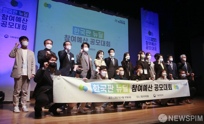 [서울=뉴스핌] 이형석 기자 = 이억원 기획재정부 1차관을 비롯한 참석자들이 30일 오후 서울 용산구 동자아트홀에서 열린 한국판 뉴딜 참여예산 공모대회에서 기념촬영을 하고 있다. 2021.04.30 leehs@newspim.com