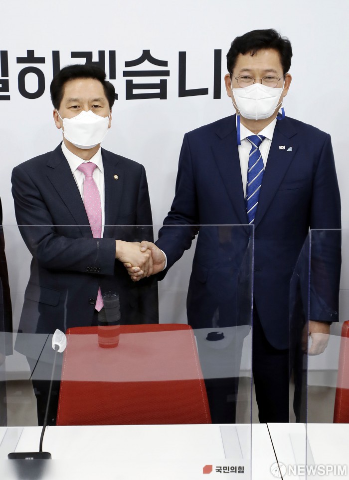 [서울=뉴스핌] 최상수 기자 = 더불어민주당 송영길 신임 대표가 3일 서울 여의도 국회에서 국민의힘 김기현 대표 권한대행 겸 원내대표를 예방해 기념촬영을 하고 있다. 2021.05.03 kilroy023@newspim.com