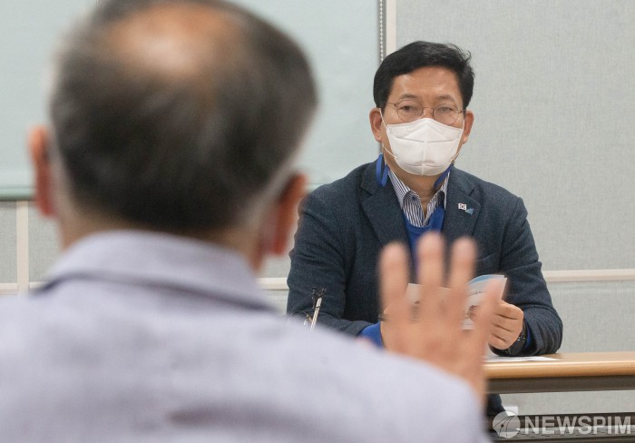 [서울=뉴스핌] 윤창빈 기자 = 송영길 더불어민주당 대표가 5일 오전 서울 관악구 동명아동복지센터에서 김광빈 원장의 발언을 경청하고 있다. 송영길 대표는 이날 어린이날을 맞아 동명아동복지센터를 방문해 관계자와 아이들을 격려했다. 2021.05.05 pangbin@newspim.com